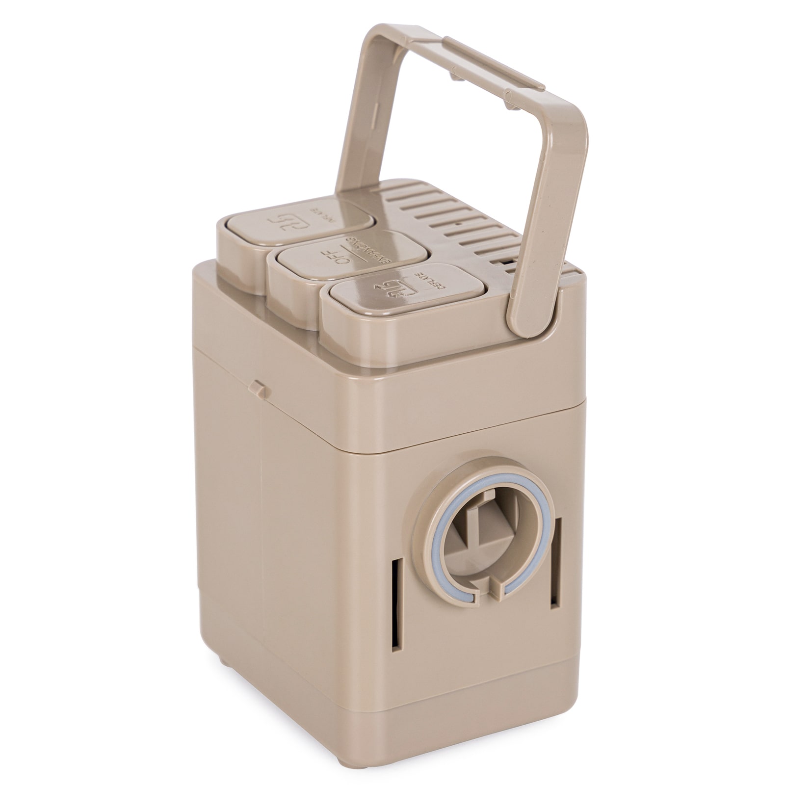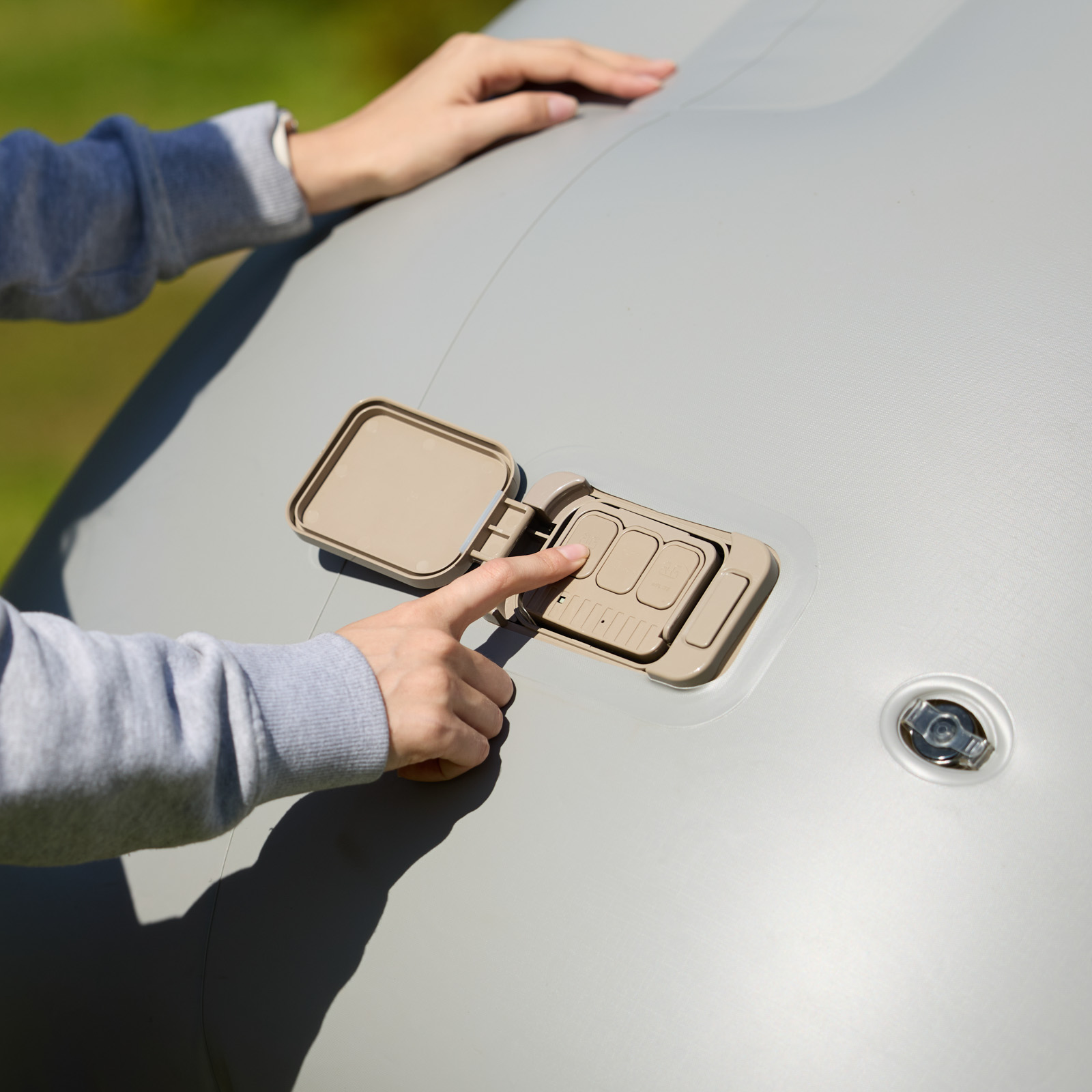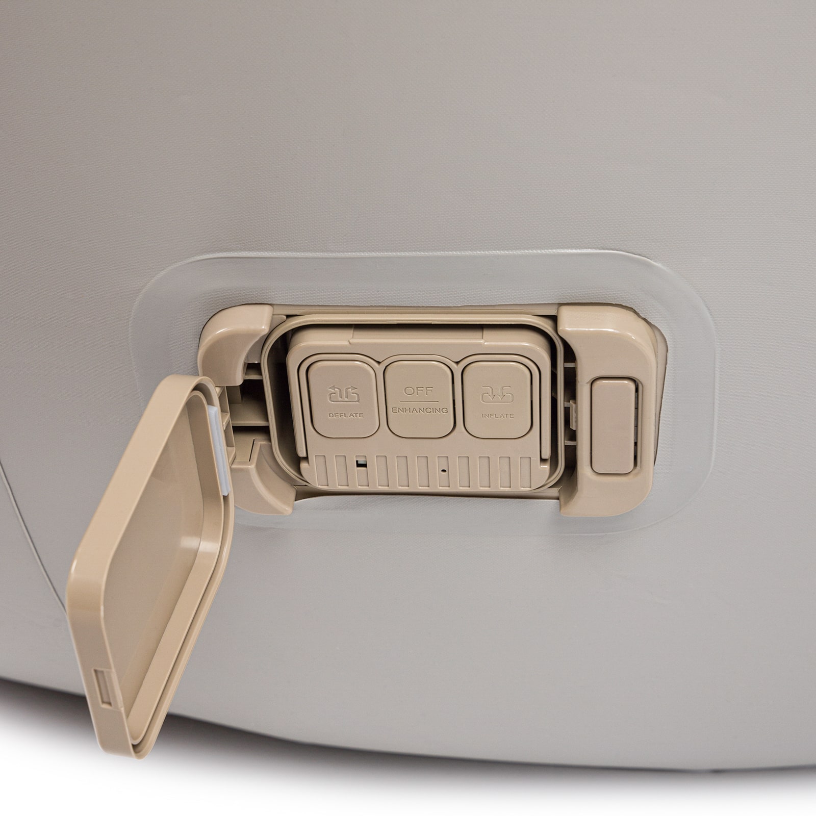 Надувается и сдувается за 3 минуты. Управляется при помощи трех кнопок в основании. Блок управления с насосом — съемный. Его можно извлечь из кресла и использовать для другой надувной мебели. Работает от встроенного аккумулятора и заряжается по USB Type-C.